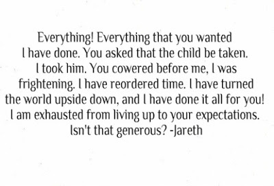 So that's part of the reason why Labyrinth made such an impact on me. But there's more! The relationship between Jareth and Sara is a deeply uneasy one in which power and sexual attraction are double-edged weapons. It's creepy and complex, and in the end it turns out that the Goblin King is as trapped as she is.