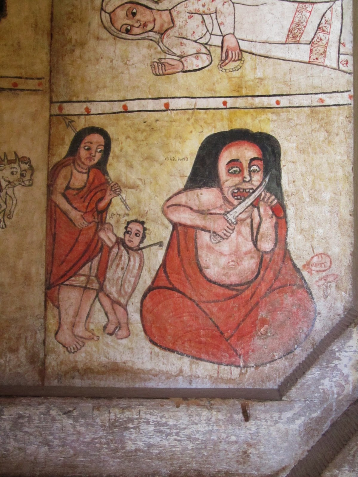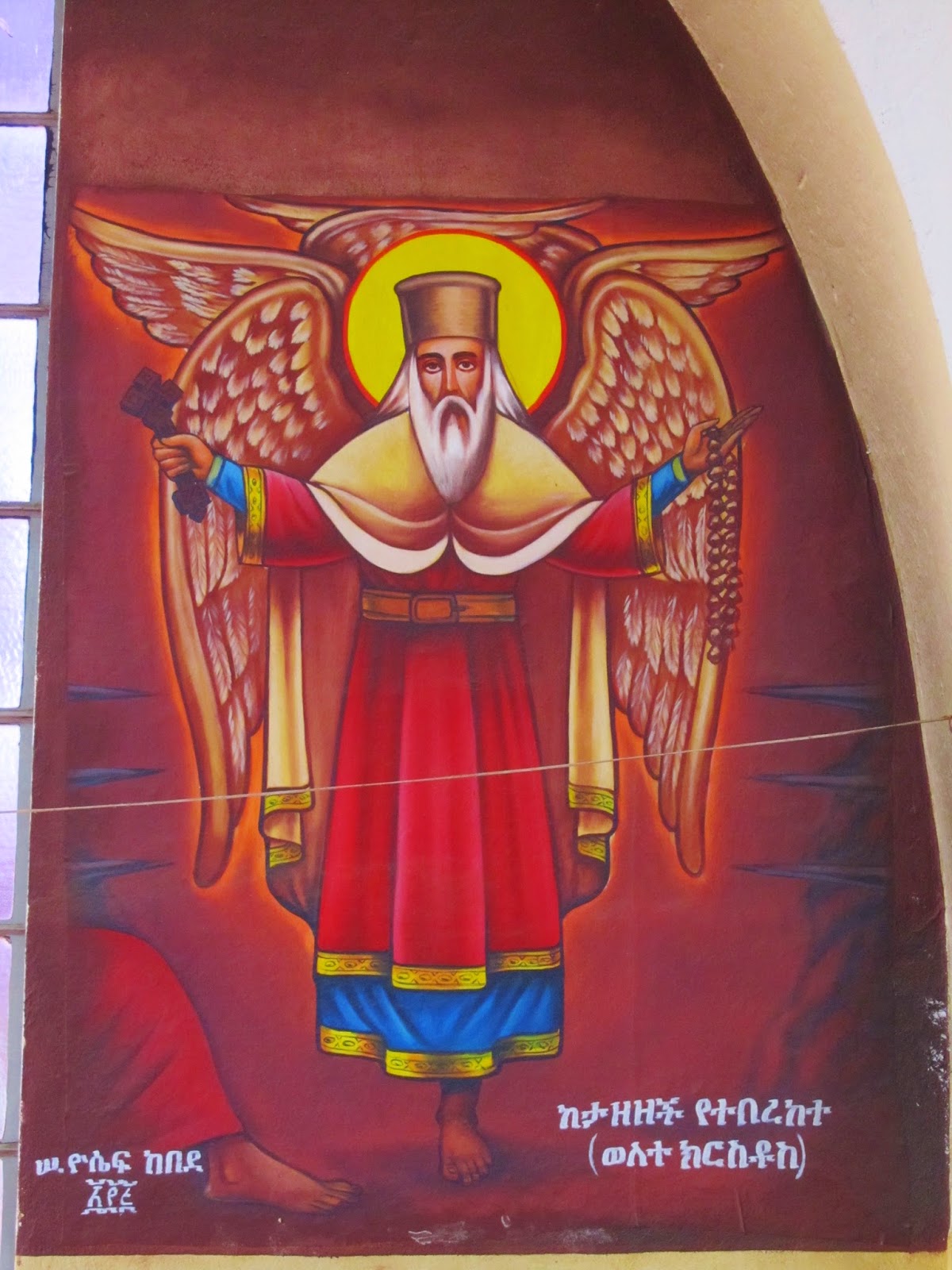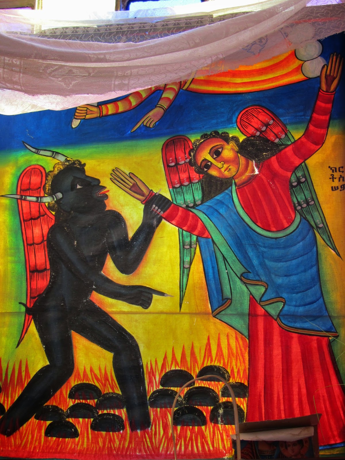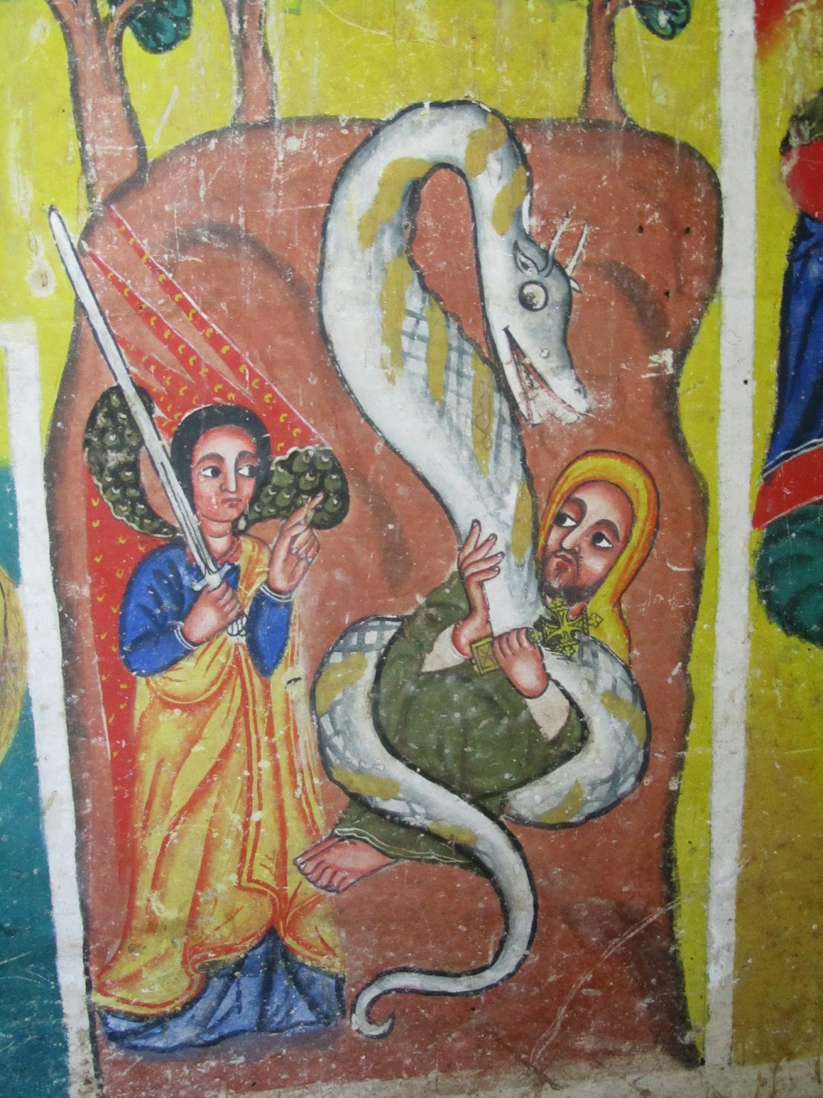 This is St Abuna Aregawi - one of the founding "Nine Saints" who converted Ethiopia between them. He wanted to build a monastery at the top of an inaccessible cliff - so a huge python obligingly lowered itself down, picked the saint up and lifted him 50ft to the top. The monastery is still there, btw