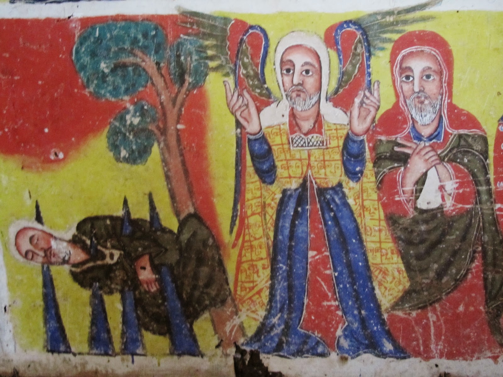 Note toeless leper (small figure)This is St Abuna Aregawi - one of the founding "Nine Saints" who converted Ethiopia between them. He wanted to build a monastery at the top of an inaccessible cliff - so a huge python obligingly lowered itself down, picked the saint up and lifted him 50ft to the top. The monastery is still there, btw