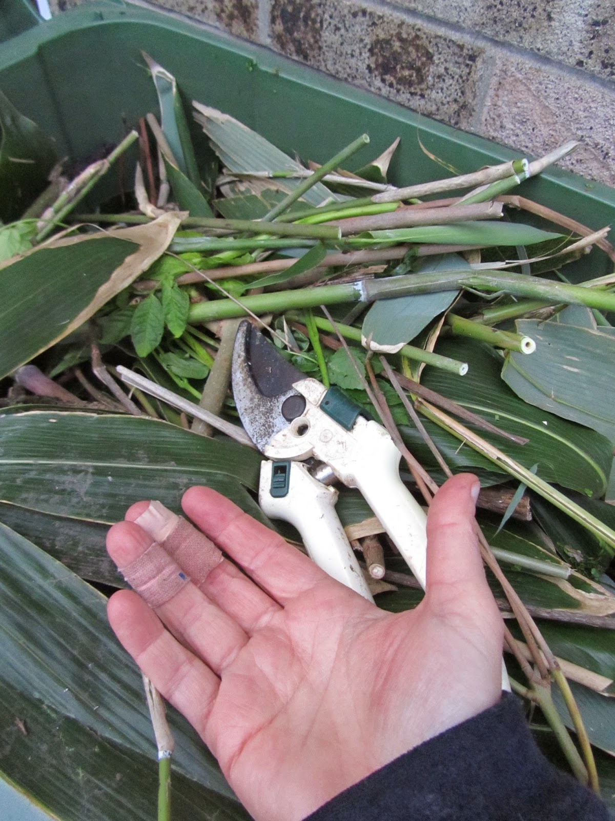 Two wheelie bins filled with hacked up bamboo ... results in a load of blisters.