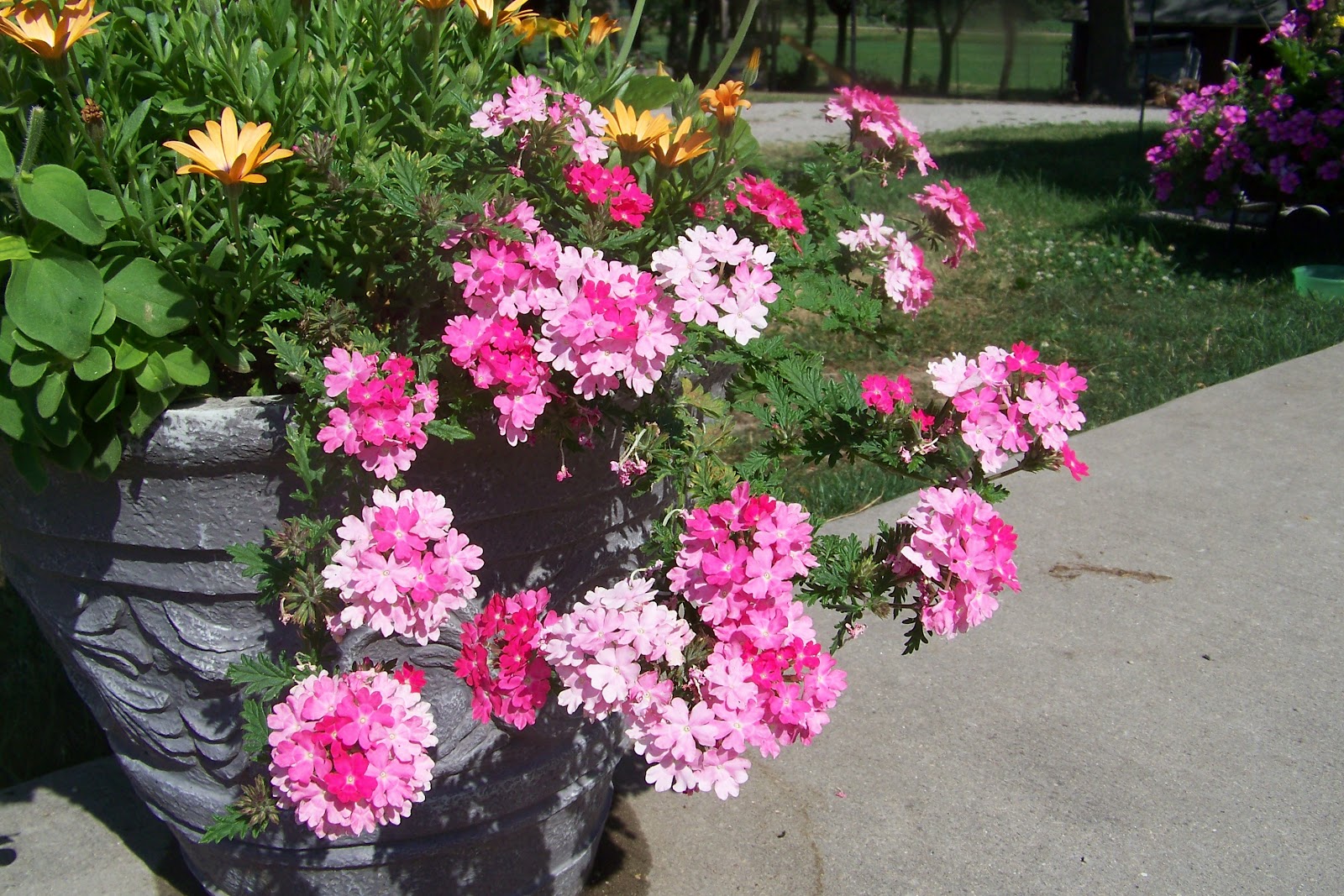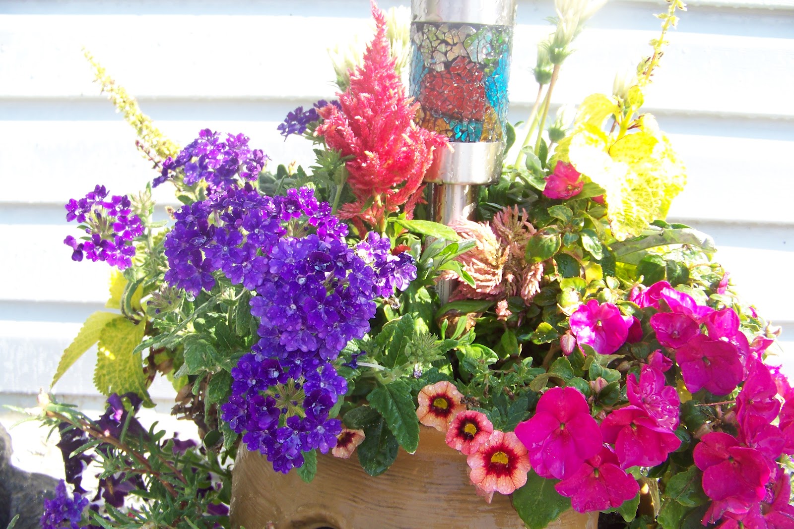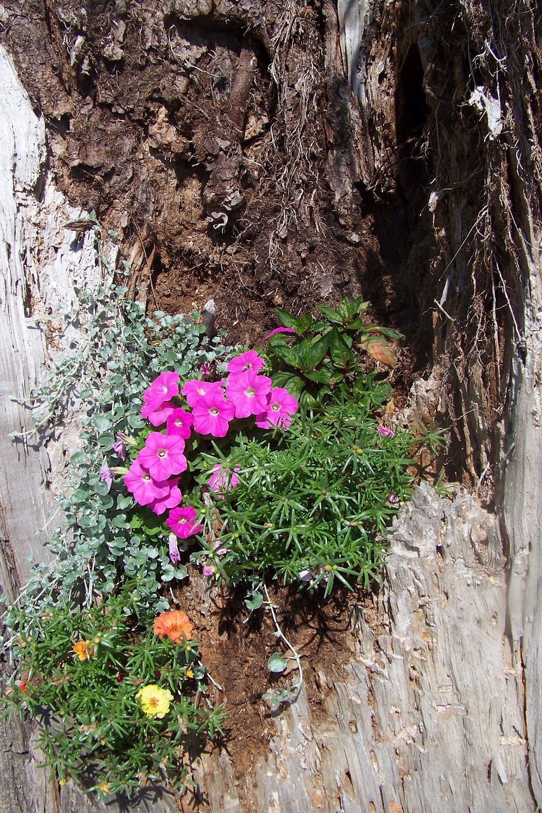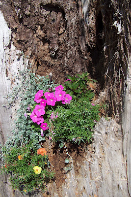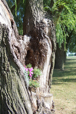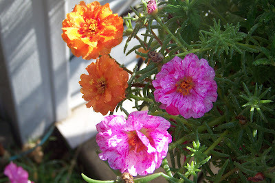 I'll start with the moss roses. Remember last year when the storm blew down part of our willow tree? Well, thanks to my daughter planting some grass in the broken part of the tree, I got the bright idea of planting flowers in there instead. She wasn't too happy with me for ripping out her carefully nurtured grass (I didn't know she did it!), but it turned out real pretty. Nice bright surprise for cars driving by.