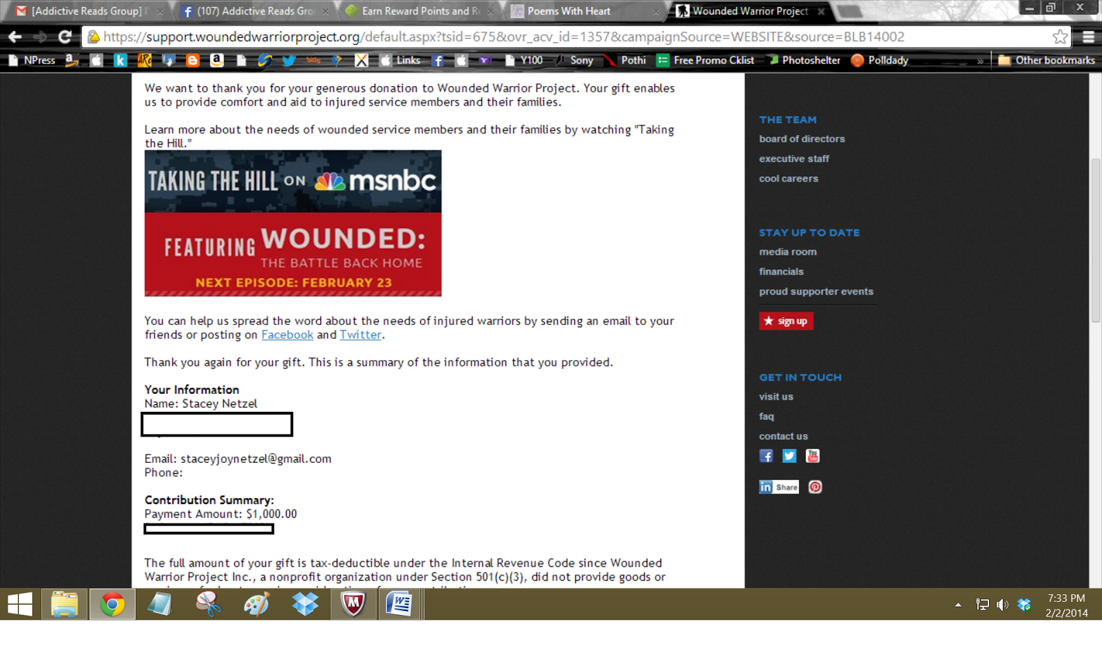 Again, all because of the generosity of my wonderful readers who purchased MISTLETOE MAGIC during the month of December 2013 for a total royalties of 918.38, I rounded up and was able to make a $1000.00 donation to the Wounded Warrior Project.