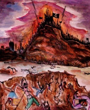 O’Brien throws a rhetorical red herring at us in the shape of an initiation narrative that is replete with disobedience, violent imaginings, petting, and potential arson. But the Judeo-Christian implications are hard to ignore. We find out from the poem that what we’re seeing is the aftermath of a world gone to ruin, a corrupted land whose only water supply is “clogged/ with rotting leaves, bottle / glass, condoms and rusted / batteries.” In such an environment, the children of the poem feel compelled to fulfill carnal urges of all stripes. Animalistic “humping” against one another “on discarded cushions / speckled with mold” becomes a kind of grotesque parody of genuine love-making as outlined in The Song of Solomon. And instead of beating their swords into ploughshares, the children take sticks and “beat them into swords” to make war against one another in a reversal of Isaiah 2:4.