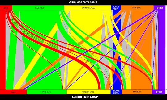 This information comes from a 2008 Pew study. The top bar shows the percentage of Americans in the 2008 survey who indicated they were raised in the given religion. As you can see, a lot of people indicated that grew up Catholic or Evangelical. The Mainline bar is a bit smaller and None, Black Protestant, and Other are quite a bit smaller.