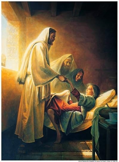 Rissa Fuller: As he grew into an adult he had an amazing ministry. Walking the streets and preaching, healing, teaching, blessing and comforting. He performed miracles, like the one in the picture below where he healed Jarius' daughter, walked on water, calmed storms, multiplied food and forgave sins.