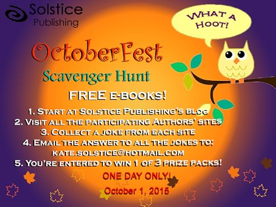 October is just moments away and what does that mean? Autumn, crisp air, pumpkin spice lattes and FREE BOOKS! Solstice Publishing is celebrating with OctoberFest. Kicking it off is a ONE DAY ONLY event on October 1st - A Scavenger Hunt! Visit Solstice to find the links to different Solstice author's sites each website offers a joke. Collect the answers to all the jokes and email them to Kate.Solstice@hotmail.com to be entered to win. The first 3 with all the correct answers win the great prizes shown below - including my novel, Justice Burning, in the First Prize pack.
