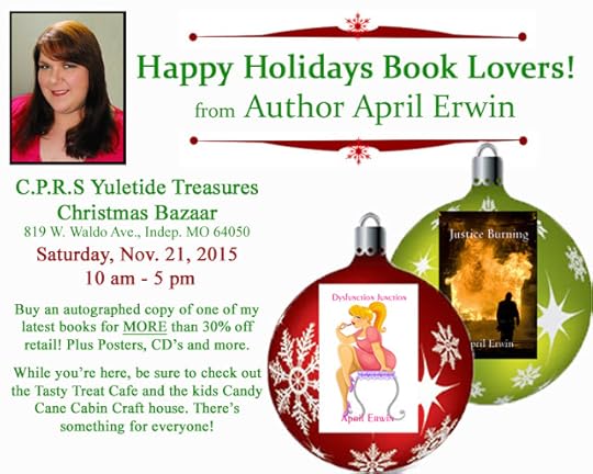 Join me for my first book signing this year. Get autographed copies of Justice Burning or Dysfunction Junction at more than 30% off retail. Talk about a great Christmas gift, right? I'll have lots of bonus things on hand as well, so be sure to come by and visit.