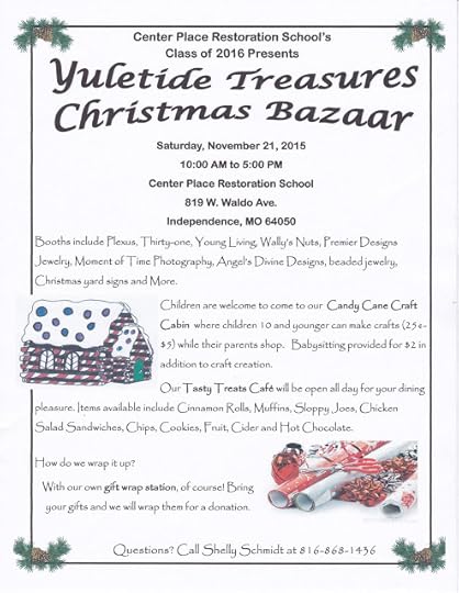 * Saturday, November 21, 2015 at CPRS in Independence, MO at the Christmas Bazaar.from 10am-5pm.