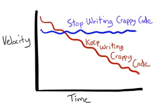 Yes, this is a simplification, but the difference is real. If you Keep Writing Crappy Code, you get slower and slower over time (as you spend more and more of your time wrestling the code). If you Stop Writing Crappy Code, you get a more sustainable pace. But there is velocity cost – you will slow down in the short term.