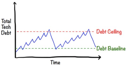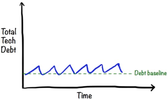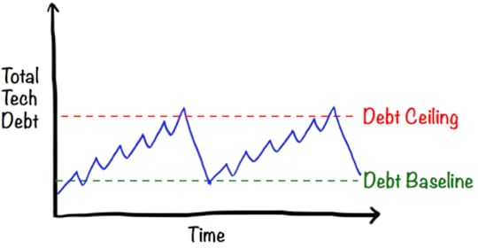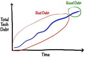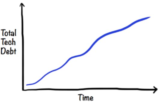 Now think of any system you’re working on. Grab a piece of paper and draw a technical debt graph over time. It’s hard to numerically measure technical debt, but you can think of it in relative terms – how is the relative amount of technical debt changing over time? Going up? Down? Stable?
