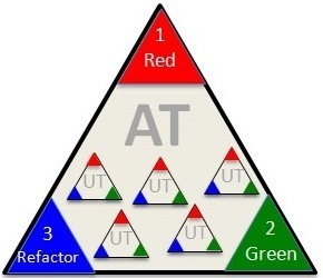 TDD can be done at multiple levels – at a feature level (acceptance tests) as well as at a class or module level (unit tests). Think of the unit tests as a bunch of triangles inside the acceptance test triangle. One loop around the big triangle involves a bunch of smaller loops inside.