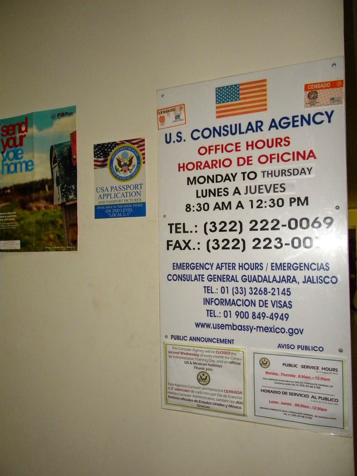The U.S. Consular Agency in Nuevo Vallarta is currently open to the public Monday through Thursday, from 8:30 AM to 12:30 PM, except closed for U.S. and Mexican holidays and on the second Wednesday every month. Other services include Passports and Emergency Services for United States citizens. Verify hours and location at http://guadalajara.usconsulate.gov/puerto_vallarta.htmlFollow us at www.HealthyLivingandTravelinginMexico.com
