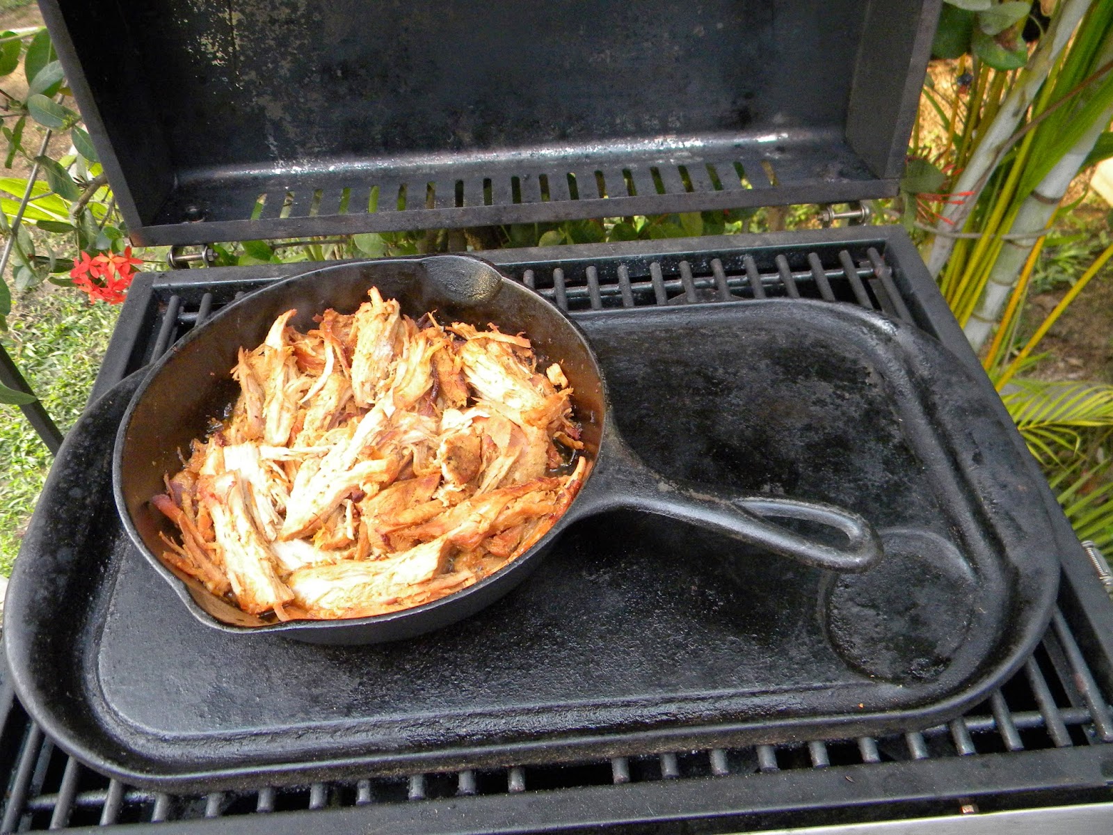 Place cast iron griddle on barbecue grill and close lid on grill. Turn grill on high heat for 10 minutes to heat griddle.Divide chunks of pork between two medium-size cast iron skillets. Pour milk over meat. Place both skillets on hot griddle and close barbecue lid (even if the lid does not close completely, this is okay). Turn barbecue grill heat to low with the goal of creating an oven at about 325 degrees. Bake the pork for about one hour, stirring and scraping the pan occasionally. If the meat appears too dry, add 1/8 cup of reserved cooking juices to each pan.Meanwhile, skim fat from reserved cooking juices and discard fat. Pour juices into a saucepan. Boil over medium-high heat until reduced to one cup, about one hour.When pork drippings are browned, add 1/4 cup of reduced juices to each skillet of pork. Scrape drippings free and stir meat, breaking into smaller pieces. Bake until juices are evaporated and drippings are browned, about 15 minutes, stirring occasionally. Repeat step, using remaining juices, and cook until edges are crisp and browned, 15 to 20 minutes longer. Remove skillets from griddle to cool. Season with salt if desired.Serving Carnitas TacosWarm corn tortillas on griddle over barbecue grill.Using forks, shred pork and pile on tortillasServe with toppings as desired. Options include chopped tomato, onion, cilantro, grated cheese, avocado slices, sour cream, and salsa.Enjoy with a cold beer or other beverage!I invite you to "Look inside" my new eBook on Amazon.com at: "Healthy Living and Traveling in Mexico" on Amazon.com