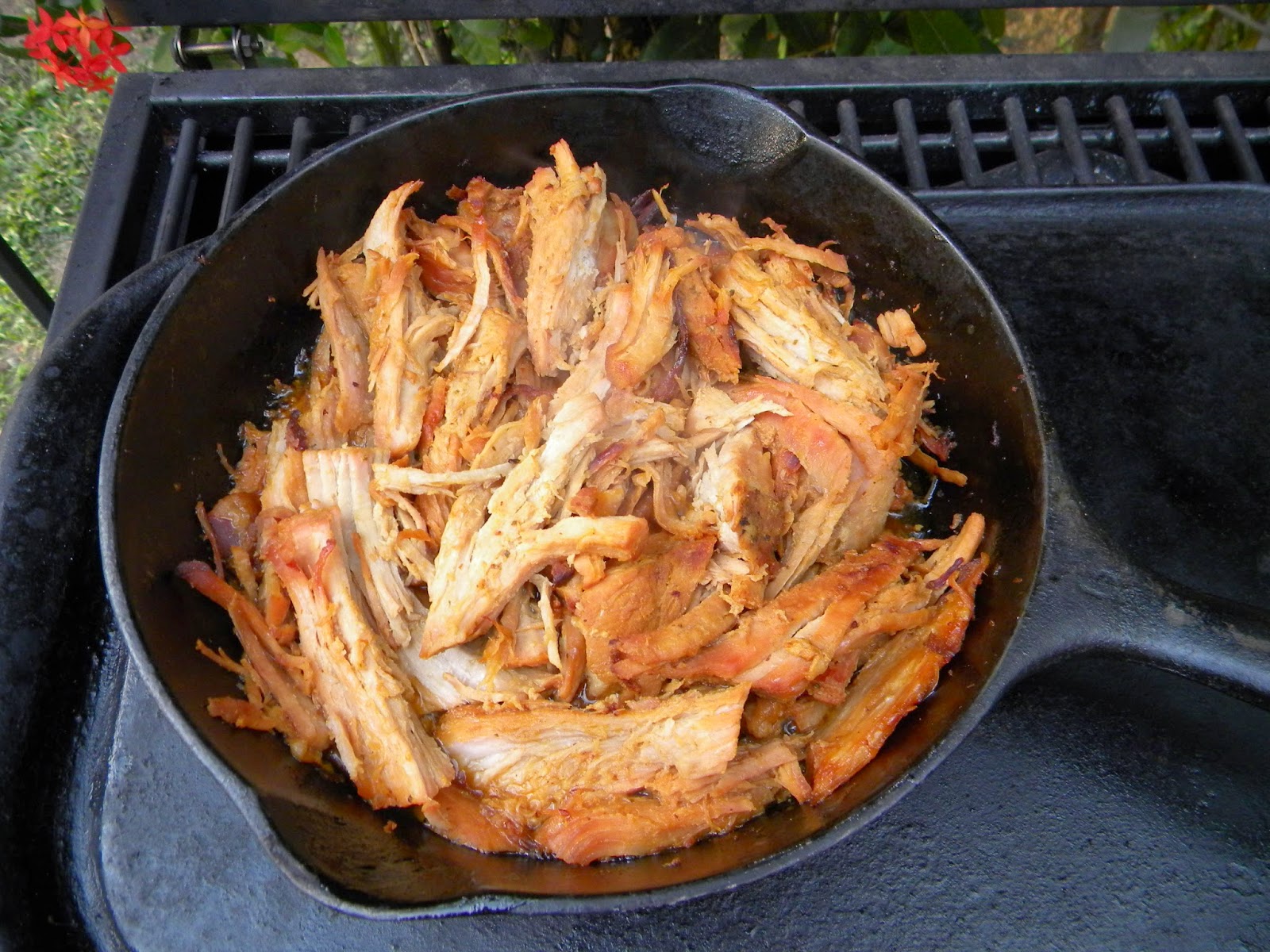 Living in a motorhome in Mexico changes how we cook. We usually cook outdoors to keep the steam and cooking oils out of the motorhome, helping to keep our tiny home clean and dry inside. The crock-pot full of broth and seasonings, set up on our outdoor table, bubbling away through-out the day, has become my favorite way to tenderize the tough beef and pork available in Mexican meat markets (carnicerías). So, I start my carnitas by slow-cooking in the crock-pot to tenderize the pork roast. This step also boils away some of the excess fat, making the carnitas more lean and healthy. Finishing the browning step in a cast iron pan set on top of a cast iron griddle on the barbecue gives the carnitas a crisp outer layer. The pork is then juicy and tender, ready to be pulled apart and shredded for use in tacos, burritos, and quesadillas. The aroma surrounding our motorhome while we prepared this delicious dish had our mouths watering for hours, and probably our neighbors', too.