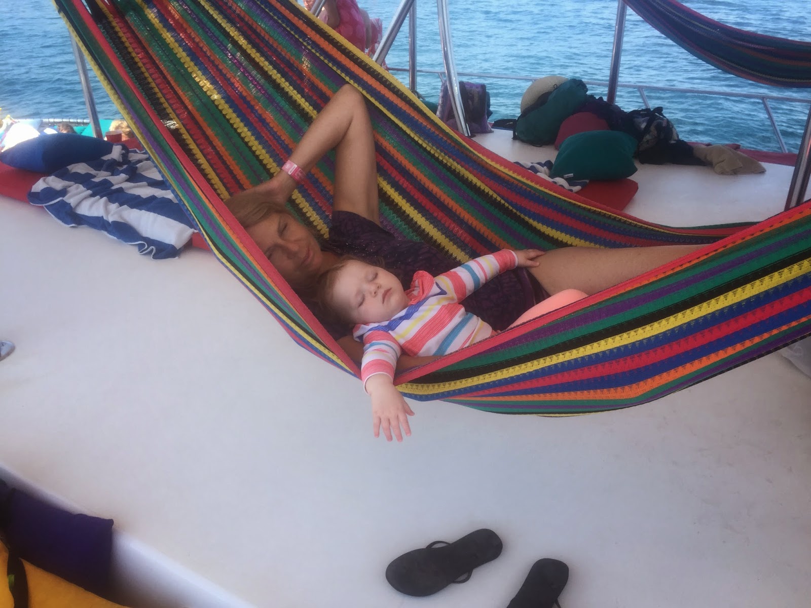 When our daughter, Michelle, and her family came to visit us in Sayulita for a week, we were looking for a fun family adventure. Our granddaughter, Juliet, had just turned one year old, so Zip-Lining was out. We decided to take the Chica Locca Whale Watching Boat Tour and it was a great decision! The boat was large enough to give everyone plenty of room to stretch out and had lots of cushions, pillows, and hammocks to relax on. The Chica Locca is a trimaran, so it was stable enough that we hardly noticed when the wind and waves picked up in the afternoon.