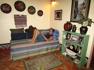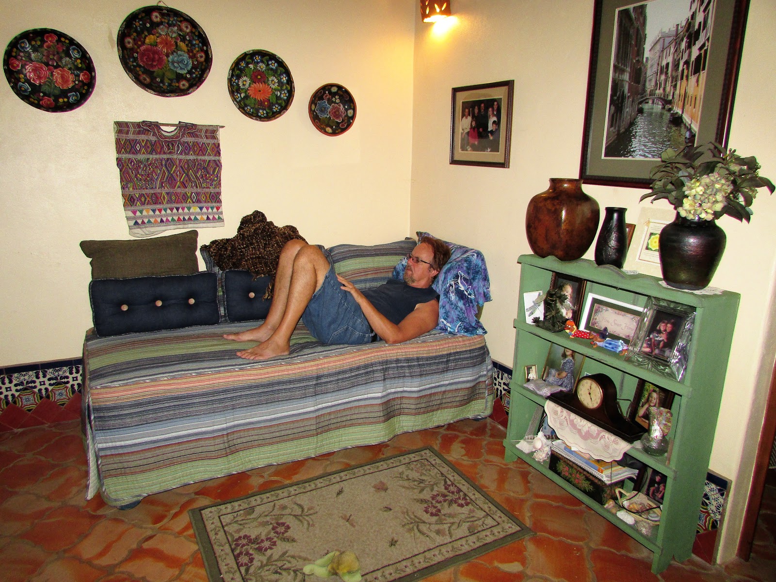 Jon Gets Pretty Lazy Reading on the Couch Retirement in México is bliss. The weather where we live is perfect all winter and spring, really most of the year. We throw the doors and windows open each morning and…get lazy. Jon settles onto the couch, reading a western novel and doesn’t move for hours. I sit down at my desk to write until I realize hours have gone by and my Fitbit is nagging me to get moving. We walk a lot more in México than we did in the U.S. Every other day we walk at a good clip to town for dinner, and then we kind of stroll home after sharing a small green salad and shrimp Alfredo, one order of flan, and each drinking two Margaritas. Our bathroom scale tells on us when we have been too lazy and eating too well the day before, reporting that our weight went up two pounds from that delicious dinner the previous night. I guess walking to and from dinner isn’t enough.