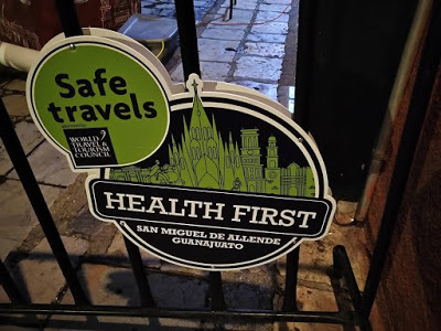 Masked Up and Ready to Enter Hank's Masks are just one of the strict requirements for going into public in San Miguel de Allende during the COVID-19 pandemic. We noticed that most people wear them here, though it appears that it’s acceptable to slide your mask down around your neck if you’re walking down the street eating an ice cream cone. Good idea!
