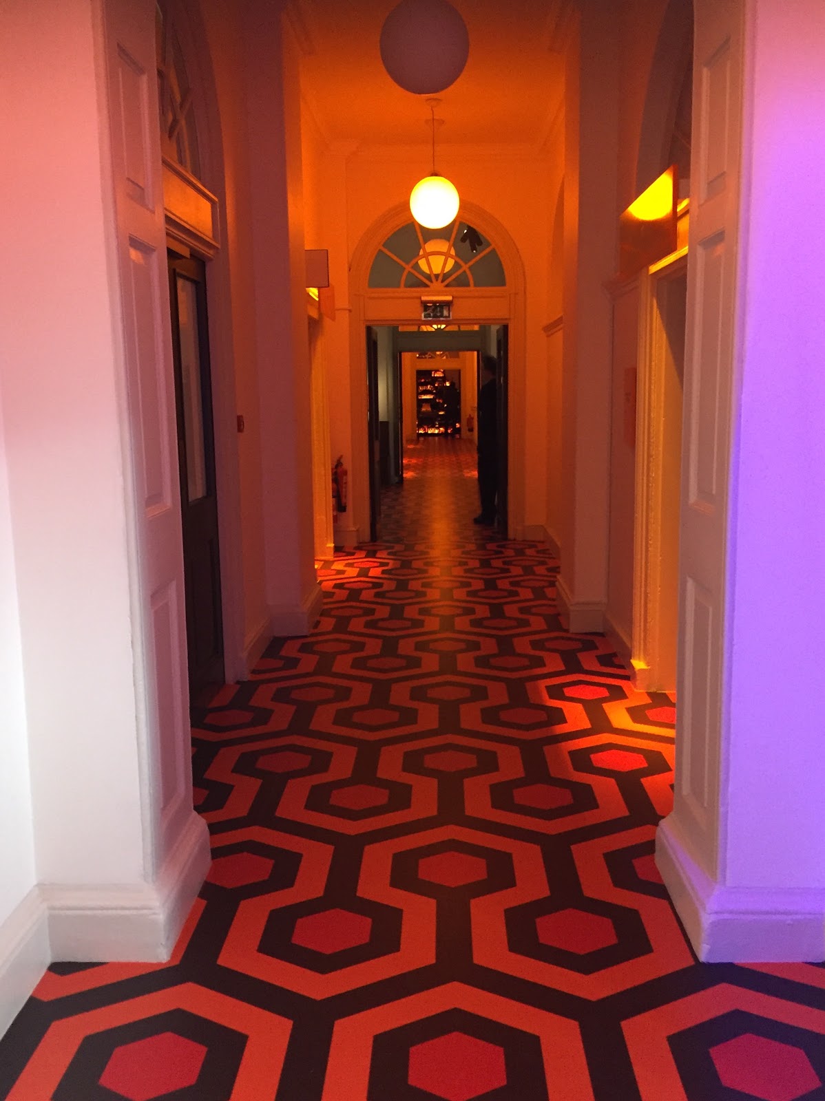 This piece, by Mat Collinshaw, projects the face of a chimp over the image of a skull, all inside a space helmet. It's called Alpha-Omega and is of course a response to 2001. Beyond this subtle beginning to the show, you enter this corridor, which fans of The Shining will appreciate: