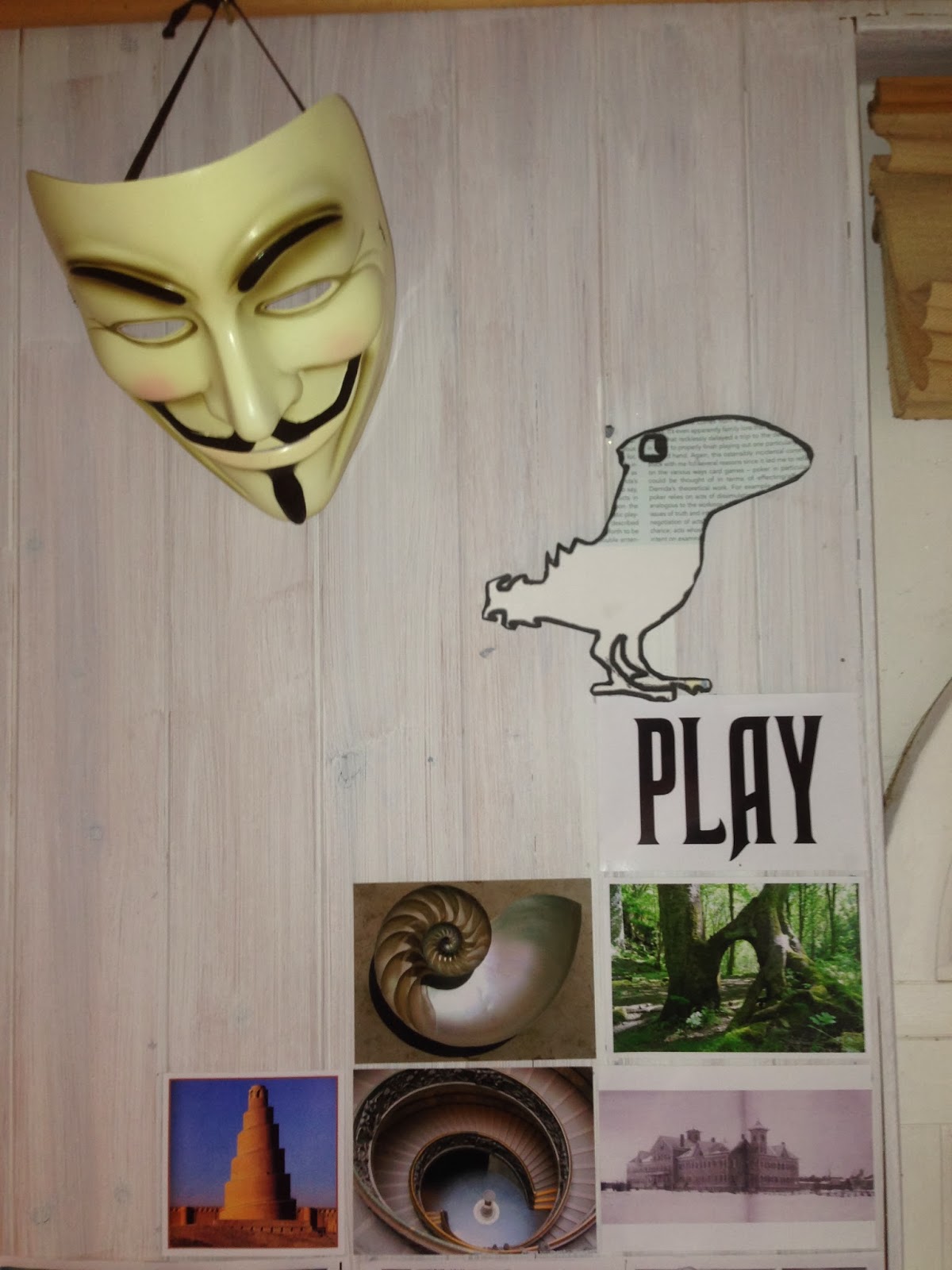 High up on the wall are a couple of guardians – ‘V’ from Alan Moore’s V for Vendetta, one of my favourite films, and Edgar the raven, both of whom make me smile every time I walk into my shed. That’s more important than in sounds, and links to the word that Edgar’s standing on. That one word – PLAY – is the single most important thing I’ve learned in the 15 years I’ve been a published author. I’ve thought a lot about writing in that time, I’ve had moments of block, I’ve had many fears and worries and concerns about how to best do the art. The importance of play, and I mean play in a focussed yet relaxed, serious and yet fun way, cannot be denied: it underlies the best work I do, I think.