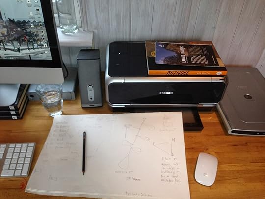 I agree with you entirely that a book has a shape! I love that idea and sometimes it’s not even something you can put into words but it does seem to help make the whole business of writing a book a little bit easier. The maps may have started as small doodles in the notebook, but at some point towards the end of the thinking/research stage, I will start to experiment on large sheets of paper with a map for the book itself. They are in pencil. They change. I may reject two or three until I find the right form. Some are almost purely geographical maps, some are more esoteric. (I blogged about the maps here.) I have to find the right structure for each book, so each map is different, but when I have (most) of it as I want it, I will finally sit down, chapter one, line one, and begin to write…