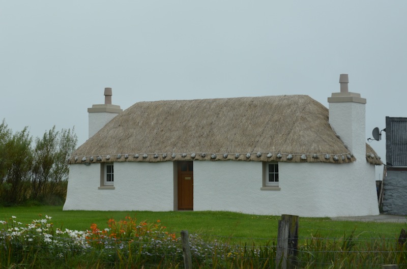 This afternoon we drove down to South Uist, passing some really pretty cottages, such as this thatched number whose roof appeared to be held down by rocks on a rope…