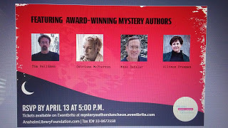 I’m honored to be one of the mystery authors who will be on a panel for a luncheon sponsored by the Anaheim, CA, library in April. The moderator is Allison Brennan and the other panelists are Timothy Hallinan and Catriona McPherson. I’m particularly looking forward to this event because Tim, Catriona and I have all written humorous mystery novels among our published books, In preparation, I’ve read books by each of the participants to be current on their writing.
