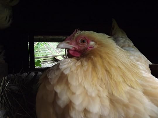 Cautiously she turned her head and peered across the room to the curtain rail over the low window. The small, shiny eyes which blinked back at her belonged to a very large, very orange, and very baffled-looking chicken.