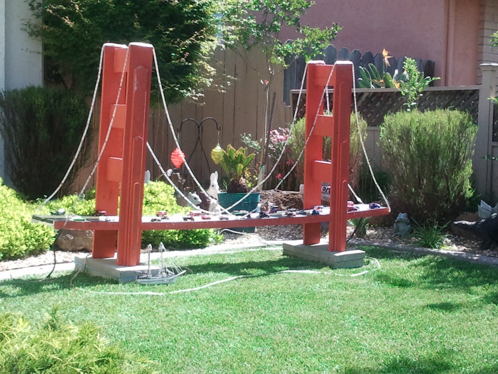 Today, I noticed this cool scupture in front of one of the houses on the street. It is a wooden golden gate bridge complete with cars and a small boat. The man at the house said I could take a picture. He said his father had made it. I didn't ask his father's name but I wished I had. Anyway, just wanted to share.