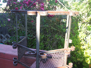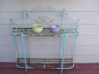 Yesterday, I passed a man cleaning out the side of his house. He said he was just trying to get rid of things that they collected. He had a bunch of stuff stacked on the sidewalk. There was piles of tiles, two pieces of granite, one piece of marble, bricks, octogon shaped brick pavers, dozens of flower pots and this cool looking iron garden shelf. The green planter shelf below caught my eye. I love shabby chic decor. I asked him if I could have the two iron pieces he had and he said yes. I then carried them back to my office and put them in the car.