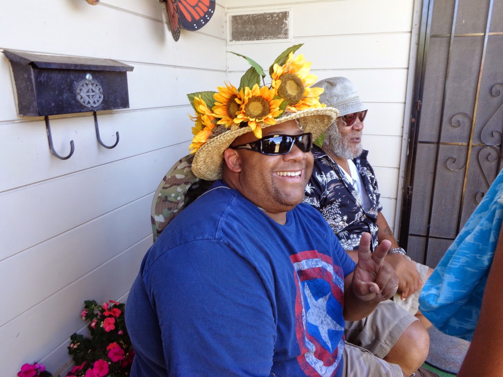 Here are two photos of my brother wearing my mother's sunflower hat.