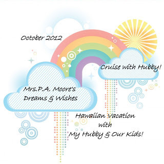My goal is to take a cruise with just hubby and I next February if not sooner, when the younger kids are out of school. No, they wouldn't be traveling with us this time but they could stay with their grandparents or aunts/uncles and cousins for the week. I've been trying to save the money for the cruise and have faith that it will come. There were only three cabins left in the category I want the last time I checked.