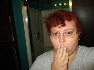 I picked up a temporary kit for the roots problem. Since it was temporary, and I was thinking of Velma, I went a little more chestnut. This was a mistake. The color that went on top of brown is okay, but the color that went on top of gray is so blatantly, almost fluorescently red. Good to know. I had hoped I could blow dry my hair straight and then curl it under. I did blow it out some, but I still had a ponytail going, and way too red.