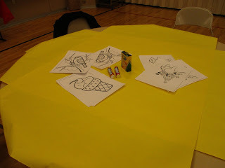 Tablecloths would not be a good surface for coloring, but the tables at the church are a little bumpy too. Okay, we will put butcher paper across the tables. It is smooth, people can draw if they want, and it adds to the color, as we had tables that were red, orange, yellow, and blue.