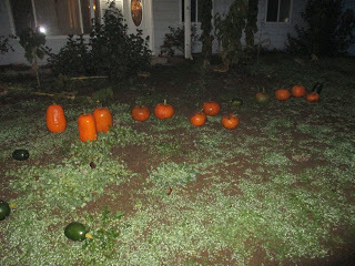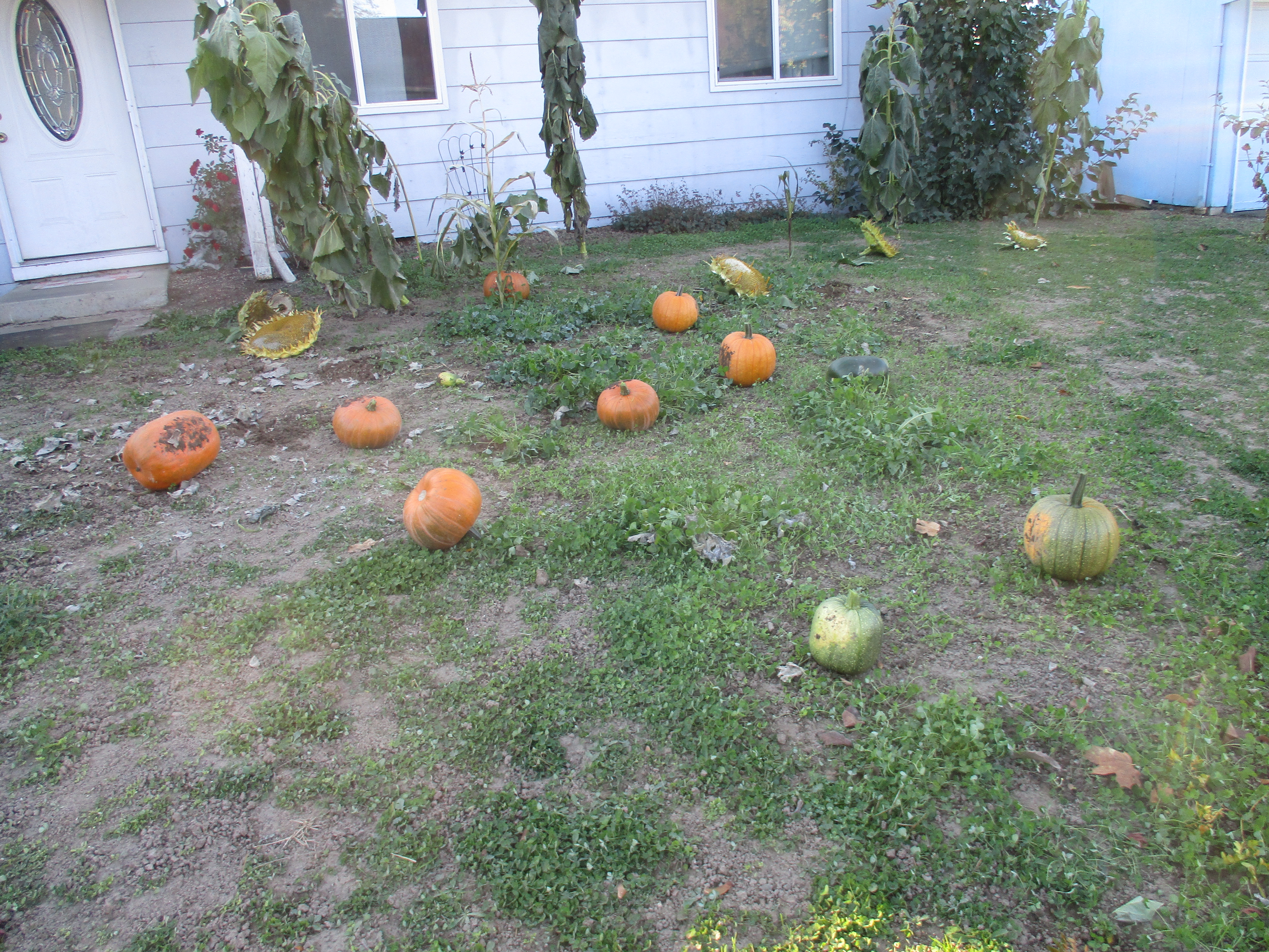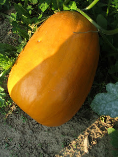The pumpkins have not gotten as much attention because the leaves hide them pretty well, especially when they are green. I have about ten that are orange now, though there is no angle from which you can see them all.