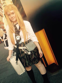 My daughter, Emma, cos-playing as the lead female in Btooom! at AVCon recently, including a blonde wig.