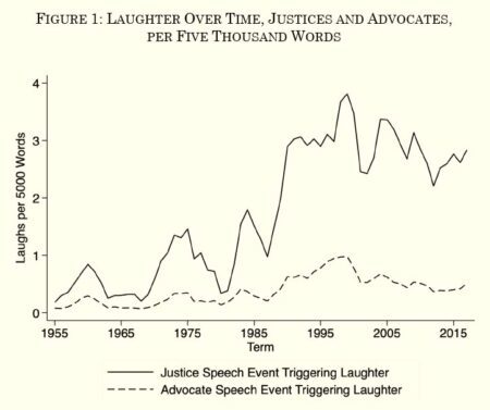 Then, in 2019, Professor Tonja Jacobi (Northwestern Pritzker School of Law) and Professor Matthew Sag (Loyola University Chicago School of Law) took the matter further with another study which looked (amongst other things) at laughter over time initiated by justices and advocates, per five thousand words (1955 – 2015).