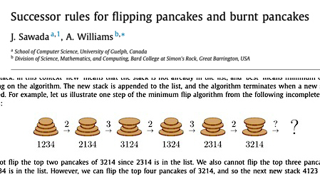 “Successor Rules for Flipping Pancakes and Burnt Pancakes,” Joe Sawada and A. Williams, Theoretical Computer Science, vol. 609, part 1, 4 January 2016, pp 60-75. The authors, at the University of Guelph and at Bard College at Simon’s Rock, report: