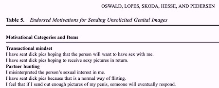 “The purpose of this study was to investigate differences in the motivations, personality aspects, and sexualities of men who send unsolicited genital images relative to men who do not send such images. Within our sample of 1,087 heterosexual males, 48% (n = 523) confirmed that they had engaged in sending unsolicited dick pics, suggesting that this behavior is common amongst heterosexual men…. [Our] findings are consistent with previous literature indicating that men often send such images in the hopes that the recipients will be turned on by the images and reciprocate the behavior.”