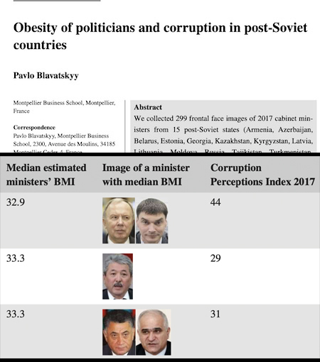 The study is: “Obesity of Politicians and Corruption in Post‐Soviet Countries,” Pavlo Blavatskyy, Economic of Transition and Institutional Change, epub 2020. (Thanks to Gabriel Istrate for bringing this to our attention.) The author, at Montpellier Business School, France, explains: