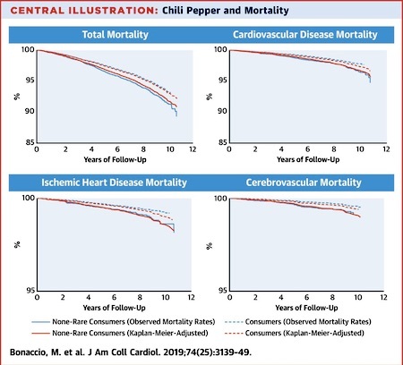 “Chili Pepper Consumption and Mortality in Italian Adults,” Marialaura Bonaccio, Augusto Di Castelnuovo, Simona Costanzo, Emilia Ruggiero, Amalia De Curtis, Mariarosaria Persichillo, Claudio Tabolacci, Francesco Facchiano, Chiara Cerletti, Maria Benedetta Donati, Giovanni de Gaetano, Licia Iacoviello and on behalf of the Moli-sani Study Investigators, Journal of the American College of Cardiology, vol. 74, no. 25, December 2019.