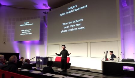 We first tried this in a show at the University of Manchester, UK, on Wednesday evening, March 11, 2020. It worked. People paid more attention to NOT touching their eyes, nostrils, or mouth