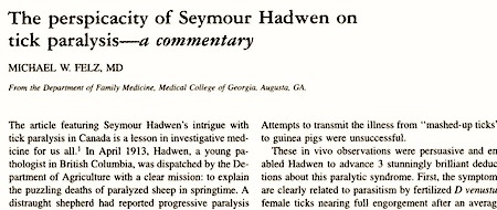 “The Perspicacity of Seymour Hadwen on Tick Paralysis — A Commentary,” M.W. Felz, Wilderness and Environmental Medicine, vol. 11 No. 2, 2000, pp. 113-121. The study’s author explains: “A commentary on a study of tick paralysis by Seymour Hadwen [pictured here, we think] is presented. Clinical and investigative insights are evaluated. The similarities between Hadwen’s observations and those of Allen Steere involving Lyme disease are explained. Research and clinical observations supporting Hadwen’s findings are discussed.”