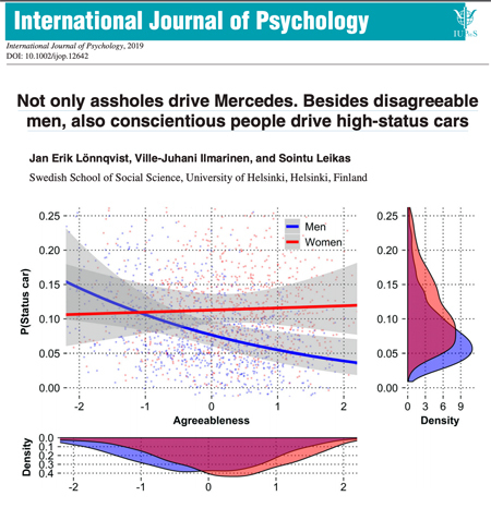 The study is: “Not Only Assholes Drive Mercedes. Besides Disagreeable Men, Also Conscientious People Drive High‐Status Cars,” Jan Erik Lönnqvist, Ville‐Juhani Ilmarinen, and Sointu Leikas, International Journal of Psychology, epub 2019. (Thanks to Kristine Danowski for bringing this to our attention.)