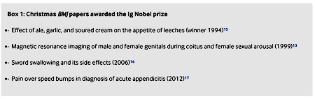 Perhaps unsurprisingly, given the focus on quirky research questions, several other Christmas BMJ papers have also received the prize (box 1). These papers have examined the effect of different foods on the appetite of leeches, explored the occupational hazards of sword swallowing, and assessed the predictive value of abdominal pain in people with appendicitis when they go over speed bumps.