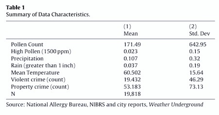 “We consider the responsiveness of crime to a pervasive and common health shock which we argue shifts costs and benefits for offenders and victims: seasonal allergies. Leveraging daily variation in city-specific pollen counts, we present evidence that violent crime declines in U.S. cities on days in which the local pollen count is unusually high and that these effects are driven by residential violence. While past literature suggests that property crimes have more instrumental motives, require planning, and hence are particularly sensitive to permanent changes in the cost and benefits of crime, we find that violence may be especially sensitive to health shocks.”