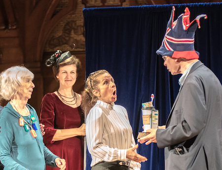 This photo shows a moment in the ceremony: Medical education prize winners Karen Pryor and Theresa McKeon receive their Ig Nobel Prize, handed to them by Nobel laureate Rich Roberts. Human curtainrod Maria Eliseeva beams at them. Alexey Eliseev took the photo.