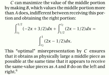 “Better Ways to Cut a Cake,” Steven J. Brams, Michael A. Jones and Christian Klamler, Notices of the American Mathematical Society, December 2006, vol. 53, no. 11, pp. 1314-21. (Thanks to Penny Grace for bringing this to our attention.) The authors explain: