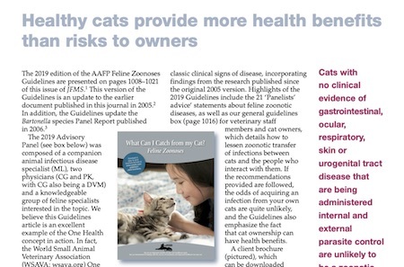 “In these 2019 AAFP Feline Zoonoses Guidelines, we discuss the most common zoonotic infections of cats and the classic clinical signs of disease, incorporating findings from the research published since the original 2005 version…. If the recommendations provided are followed, the odds of acquiring an infection from your own cats are quite unlikely, and the Guidelines also emphasize the fact that cat ownership can have health benefits.”