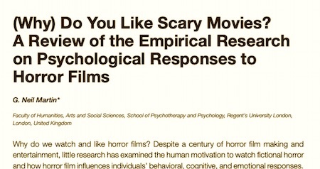 “(Why) Do You Like Scary Movies? A Review of the Empirical Research on Psychological Responses to Horror Films,” G. Neil Martin, Frontiers in Psychology, epub 2019. The author, at Regent’s University London, UK, explains: