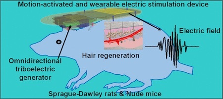 “a universal motion-activated and wearable electric stimulation device that can effectively promote hair regeneration via random body motions was designed. Significantly facilitated hair regeneration results were obtained from Sprague–Dawley rats and nude mice. Higher hair follicle density and longer hair shaft length were observed on Sprague–Dawley rats when the device was employed compared to conventional pharmacological treatments…. This work provides an effective hair regeneration strategy in the context of a nonpharmacological self-powered wearable electronic device.”